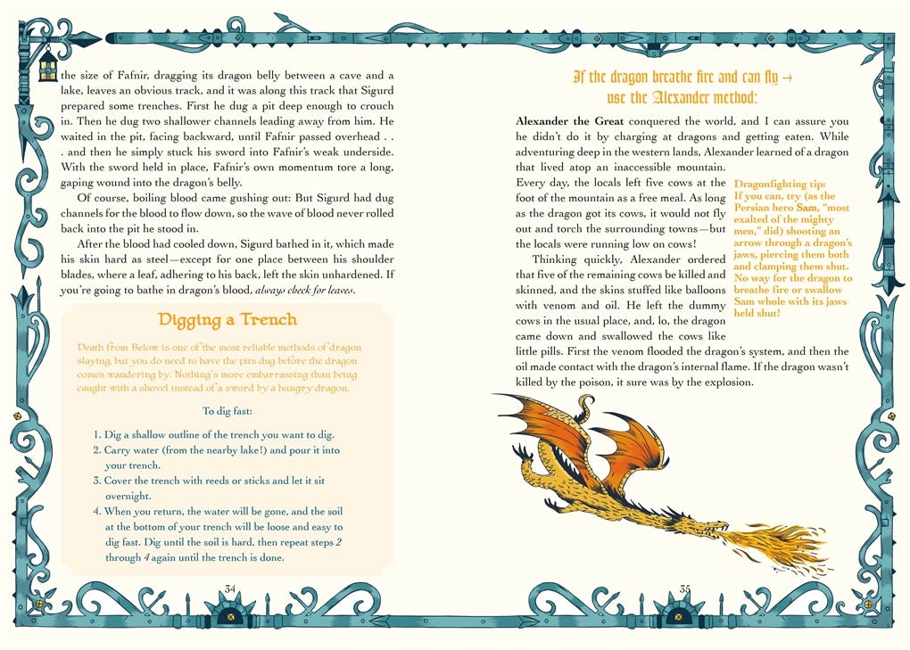 Anyway, I wanted to share a few (somewhat randomly assembled) internal pages to give you an idea of what you would be in for. It is, as I always say, doubly educational because you will not only learn a lot about historical and legendary knights, you will learn how to defeat them by cheating.
