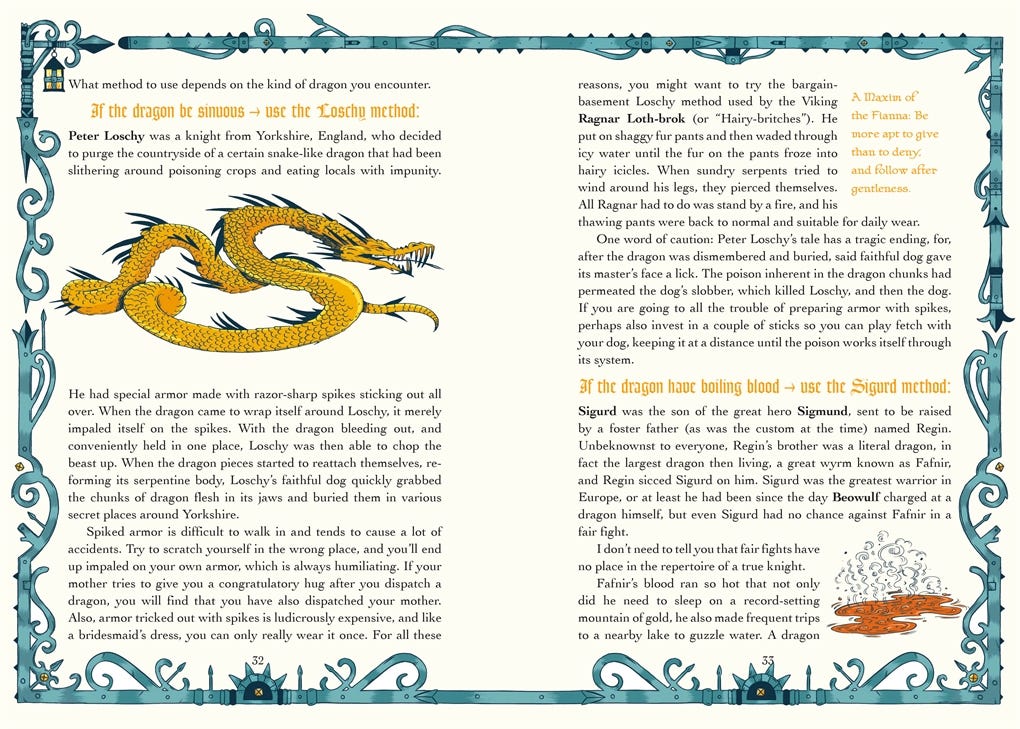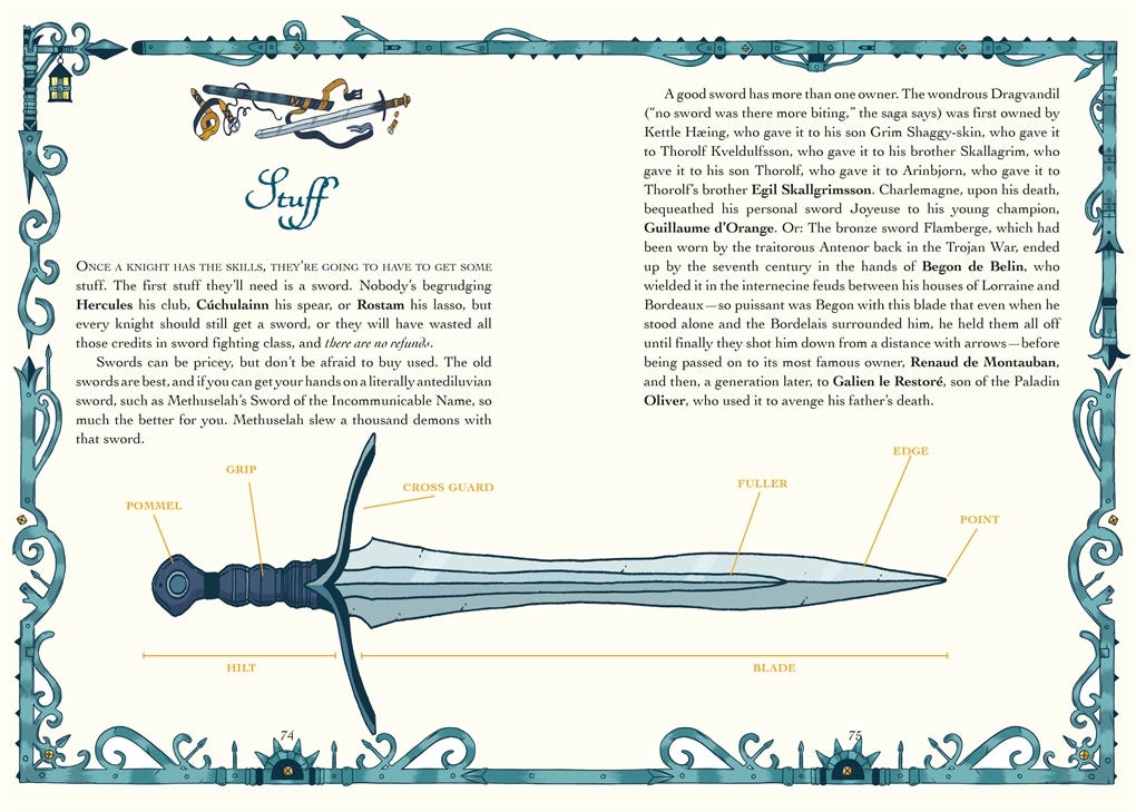 As you probably already know, I have a new book coming out this summer with boss illustrations by Cathrin Peterslund—Apprentice Academy: Knights. It is formatted exactly like last year’s Apprentice Academy: Sorcerers, except it is about 60X better, because I worked all the kinks out on the first book, and anyway there are a lot more knights, warriors, fighters, paladins, vikings, duelists, etc., in myth and legend than sorcerers, so I had more variety to choose from.