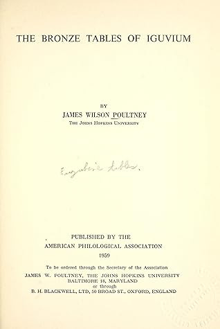 •The Bronze Tables of Iguvium edited by James Wilson Poultney (coll. 1959): Verrrry detailed accounts of Roman or para-Roman ritual practice, translated from the Umbrian. A more direct and authoritative glimpse of ancient religion than, say, Lucian above, but of course hardly meant for the casual browser of two thousand years later (i.e. me).