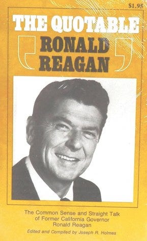 •The Quotable Ronald Reagan edited by Joseph R. Holmes (1975): I found this book on the street and gave it to a friend of mine the next day, but it was short enough that I could read it in the interim. Most interesting because of its publication date, five years before Reagan was elected president (but eight years after J.G. Ballard expressed a desire unprintable in a family substack).