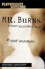 •Mr. Burns, a Post-Electric Play by Anne Washburn (2013): In the post-apocalyptic future, TV-starved masses amuse each other by recounting their favorite Simpsons episodes. Over time, the recounting becomes spectacle, then ritual. It’s like watching the birth of a cargo cult. Satire, but persuasive satire, as satire should be.