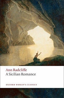 •A Sicilian Romance by Ann Radcliffe (1790): Radcliffe is famous for inventing Scooby-Doo, i.e. inventing the idea that there are gothic supernaturalities aplenty but in the end you can pull their masks off and they’re all just Old Man MacGregor looking to scare people. A Sicilian Romance isn’t her most famous book, but it’s the one I found for a dollar at the local used book store, so it’s the one I read; it’s relatively light on the supernatural, and even on the gothicicty, but as promised the mask comes off in the end. Mostly it’s one of those novels where one thing happens after another, like a story from Boccaccio.