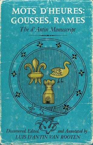 •Mots d'heures: gousses, rames: The d'Antin manuscript by Luis D'Antin Van Rooten (1967): I don’t speak a lick of French, and I found this book hilarious. My assumption is that it’s eight or nine times funnier if you do speak French. But it’s also funnier, I think, if you don’t know, at first, “the trick.” So if you speak French, especially, go seek this book out blind, read it, and tell me if it’s as funny for you as I assume it will be.