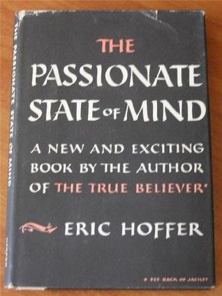 •The Passionate State of Mind by Eric Hoffer (1955): If you liked Hoffer’s The True Believer (which you should certainly read), you’ll…uh…also like The Passionate State of Mind, which is similar in theme and method, although even more aphoristic (I mean the individual pieces are shorter). A terrible title, but a book that certainly resonates today. “Were one to invent a pill which if taken before going to bed would transform men overnight into patterns of perfection, the reformer would be the unhappiest man on earth. The reformer wants to play a role; he wants to make history.”