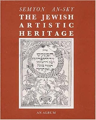 •The Jewish Artistic Heritage: An Album by…Semyon An-Sky? (1994?): I read fifty pages of introductory material and I’m still not sure what this book is. Did S. Ansky (as others call him) collect this material for publication around 1918 (as sometimes is hinted)? Was it published? Is it just his field notes? Are there other similar works included? Anyway, as a record of the Russian Jewish folk tradition from the early twentieth century, Ansky’s files, which might have some relation to this book, must be indispensable, as the remainder of the century would be busy stamping that tradition out. The art included is nice, although one should probably have more foreknowledge of the tradition than I possess (which is zero) to appreciate it fully.