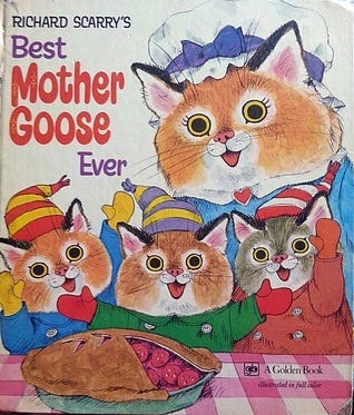 •Richard Scarry's Best Mother Goose Ever! by Richard Scarry (1961): I love Mother Goose collections! I just like seeing what rhymes are included; how they’re illustrated; someday I want to do something with the knowledge I’m gaining, but I don’t know what yet. Anyway, this one’s a good one.