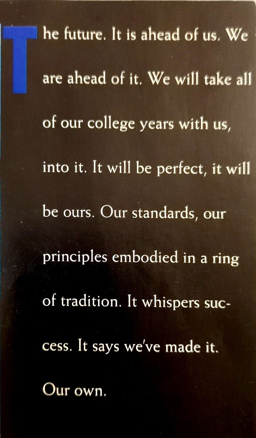 The future. It is ahead of us. We are ahead of it. We will take all of our college years with us, into it. It will be perfect, it will be ours. Our standards, our principles embodied in a ring of tradition. It whispers success. It says we’ve made it. Our own.