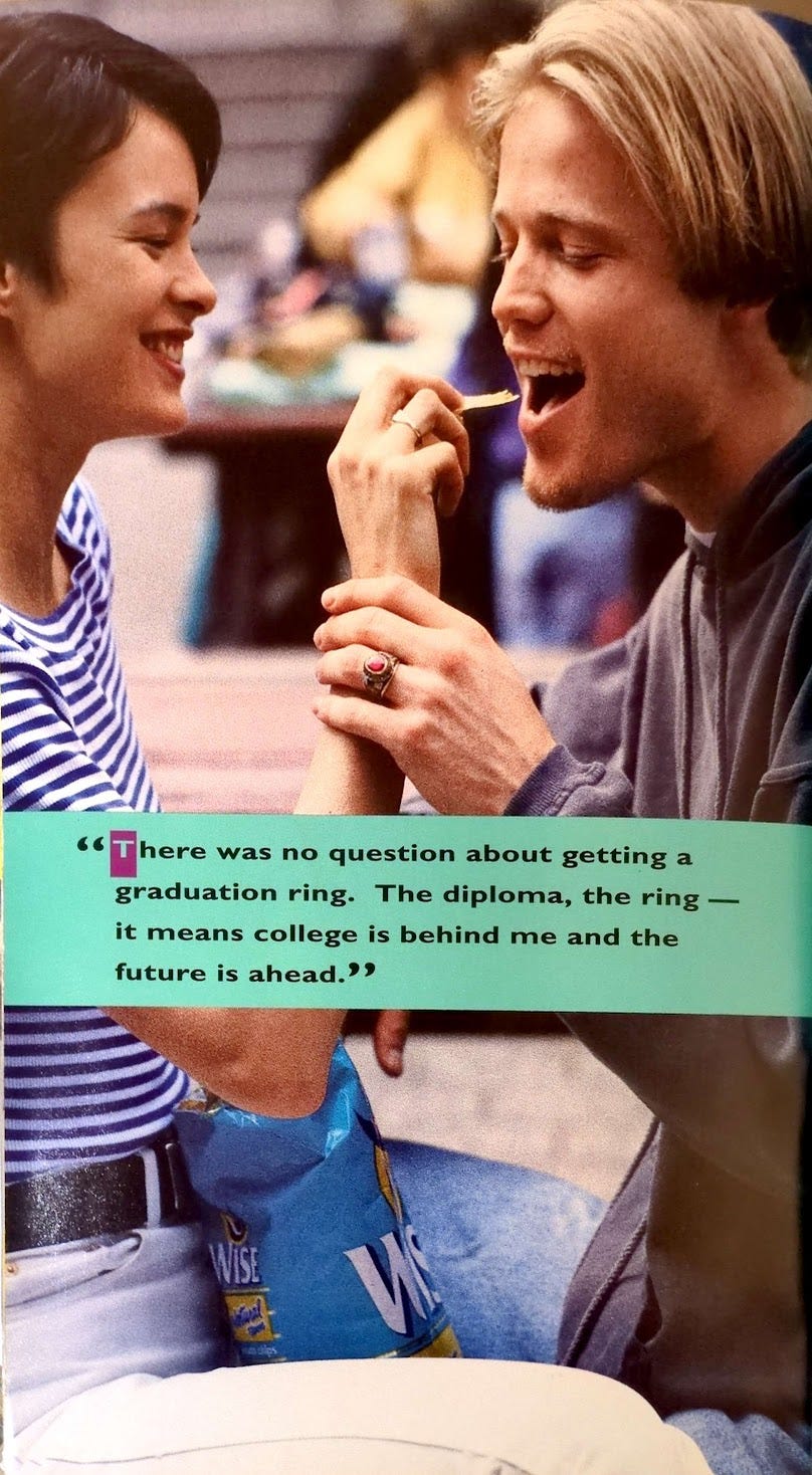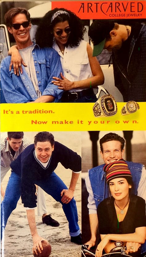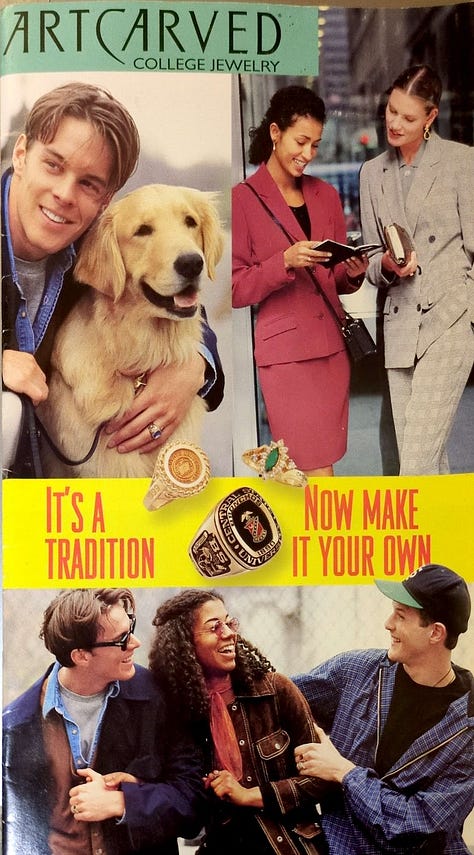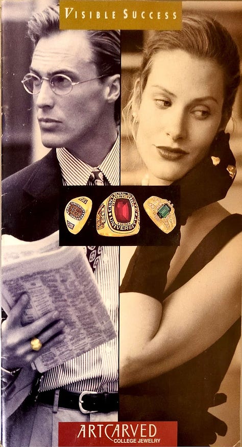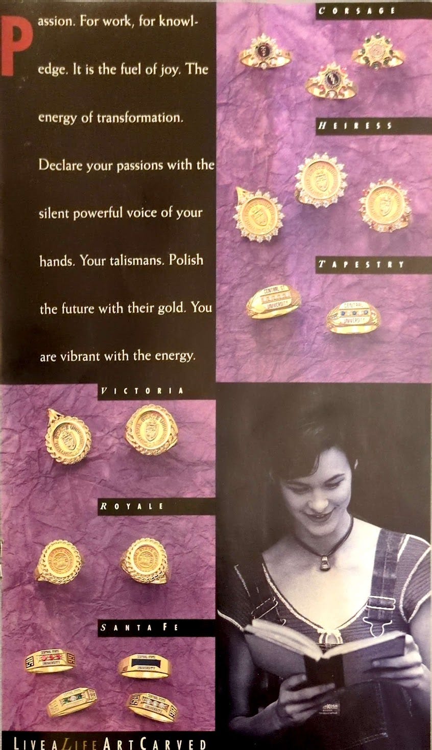 Perhaps I should have more sympathy for whoever has to write this garbage. I mean, despite what the covers of all three catalogs claim, class rings are not really a tradition any more at most schools, if they ever were, but ArtCarved can only pay the bills if it dupes people into thinking they are. And yet here once again, but for completely different reasons, we are in the realm of the false. When was the last time you were in the doctor’s office, reading a diploma on the wall, and began to fret: But where is the class ring? In no one’s mind are the two yoked.
