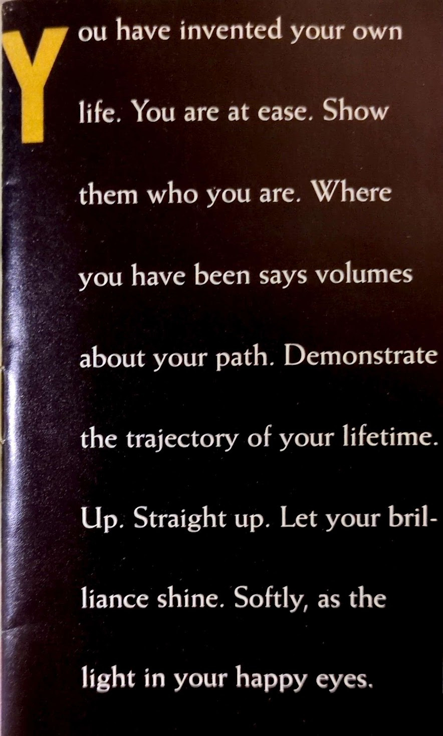 You have invented your own life. You are at ease. Show them who you are. Where you have been says volumes about your path. Demonstrate the trajectory of your lifetime. Up. Straight up. Let your brilliance shine. Softly, as the light in your happy eyes.