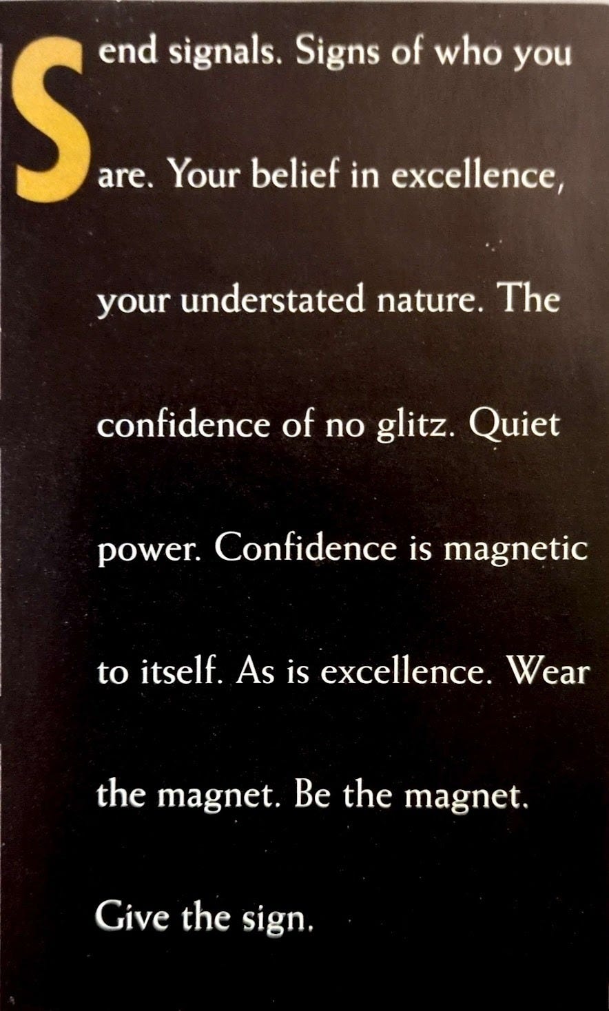 Send signals. Signs of who you are. Your belief in excellence, your understated nature. The confidence of no glitz. Quiet power. Confidence is magnetic to itself. As is excellence. Wear the magnet. Be the magnet. Give the sign.